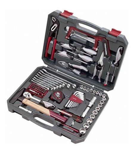 Description générale Ce coffret d'outils Kraftwerk comprend un assortiment complet de 90 pièces, idéal pour tous vos travaux de bricolage à la maison, dans le garage ou à l'atelier. Spécifications techniques Clés combinées de 8 à 19 mm Cliquet réversible, 45 dents Douilles de 6 à 24 mm Dimensions : 410 x 353 x 93 mm Poids : 6,15 kg Compatibilité et accessoires Douille adaptateur 3/8" - 1/4" Rallonge de 75 mm Douille pour bougie 16 et 21 mm Jeu de clés mâles de 1,5 à 10 mm Mètre enrouleur 3 mètres Boîte d'embouts 1/4" contenant 33 pièces Marteau d'établi de 300 gr Pointe de centrage no.2 Chasse-clou de 3 mm Clés polygonales de 8 à 19 mm Cutter de 9 mm Tournevis à fente et Phillips (PH1 et PH2) Détecteur de tension 110-250V Ciseaux universels de 185 mm Pince multiprise de 250 mm Pince universelle de 180 mm Porte-embout 1/4" Clé à écrous de 8" Scie à archet de 150 mm Installation Ce coffret d'outils est prêt à l'emploi. Aucun montage n'est nécessaire. Utilisation Utilisez ce coffret ...