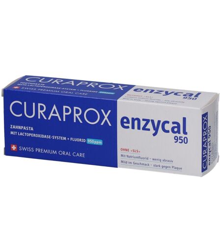 Curaprox Enzycal 950 TandpastaTeneur normale en fluorure de sodium : 950 ppm. Double protection contre la carie dentaire grâce au fluorure de sodium et aux enzymes, qui renforcent le pouvoir protecteur naturel de la salive. RDA 30 : très doux. Convient à toute la famille - dès 6 ans. Fabriqué en Suisse.• ; Sans agent moussant SLS : doux pour la bouche• ; Contient des enzymes : renforce la protection naturelle de la salive, favorise la calcification et protège contre la sécheresse buccale• ; Respectueux de l'émail des dents : pratiquement sans abrasif (RDA 30)• ; Protection contre les caries grâce au fluorure de sodium en vente libre• ; 950 ppm de fluorure de sodium• ; Réduction notable de la plaque dentaire et du tartre• ; Convient également pour une utilisation avec une brosse à dents soniqueIndicationEnzycal 950 est destiné aux personnes ayant une bouche très sensible et/ou sèche, des ulcères, des dents sensibles ou une irritation des muqueuses.ApplicationPour les enfants à partir de 6 ans et même pour les adultes, une grande quantité de dentifrice Curaprox suffit.IngrédientsAqua, silice hydratée, sorbitol, glycérine, stéareth-20, dioxyde de titane, arôme, phosphate disodique, carraghénane, chlorure de sodium, fluorure de sodium, acide citrique, benzoate de sodium, saccharine de sodium, amylglucosidase, thiocyanate de potassium, glucose oxydase, limonène, lactoperoxydase ...