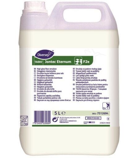 Présentation : Emulsion sols haute brillance DIVERSEY Taski Jontec Eternum F2E - 5L , anti-glissante pour tous types de sols durs, lisses et résistants à l’eau (PVC, linoléum, vinyle...). Sa combinaison de polymères spécifiques développée par Diversey permet d’obtenir un brillant prestigieux en alliant dureté, durabilité et excellente adhésion. Convient pour une application avec les méthodes conventionnelles ainsi qu’avec l’applicateur TASKI ProSpeed. Avantages : Procure un brillant prestigieux Protection durable et résistant à l’usure Excellente adhésion pour la plupart des sols Aptitude anti-glissante testée selon le référentiel de la méthode James (ASTM D-2047) Facile à appliquer et à entretenir Préserve la beauté naturelle des sols grâce à un film clair Très haute résistance au trafic et aux marques Application anti-glissante. Une sécurité garantie pour votre personnel et vos clients Caractéristiques : Aspect : liquide laiteux blanc Couleur : blanc pH pur : ≈ 8,5 pH en solution : ...