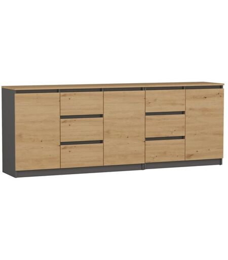 DESCRIPTION GÉNÉRALE Ce buffet moderne se compose de deux meubles indépendants, de 80 cm et 120 cm de large, réunis en un ensemble fonctionnel. Costa est un meuble pratique et spacieux qui aménagera l'intérieur de votre salon ou salle à manger. L'intérieur du meuble est composé d'étagères et de tiroirs pour bien organiser divers objets. SPÉCIFICATIONS TECHNIQUES Largeur: 200 cm Profondeur: 40 cm Hauteur: 75 cm Matériau: panneaux de particules mélaminés À monter soi-même AUTRES INFORMATIONS Style moderne, 2 portes, 6 tiroirs, finition aspect bois + gris mat, tiroirs et portes sans poignées, fabriqué en Europe. ...