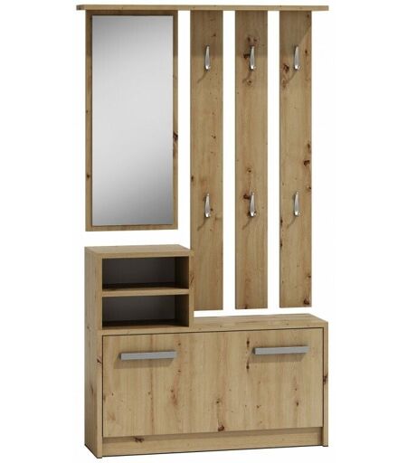 Description générale Le meuble d'entrée VITTORIA est extrêmement pratique et combine fonctionnalité et design moderne. Il dispose de six crochets pour suspendre vos manteaux, d'un grand miroir, de deux niches pour ranger les petits objets, ainsi que d'une étagère. De plus, il offre un espace de rangement pour vos chaussures pouvant accueillir jusqu'à 9 paires. Sa teinte sobre et son style contemporain lui permettent de s'intégrer harmonieusement dans n'importe quel intérieur. Spécifications techniques Dimensions : longueur : 85 cm, hauteur totale : 180 cm, profondeur : 24 cm Structure en panneaux de particules mélaminés de 18 mm Bords en PVC Fabriqué en Europe Meuble à monter soi-même avec notice fournie Assemblage aisé Fixations murales non fournies Compatibilité et accessoires Convient à tout type d'intérieur Accessoires non inclus : fixations murales Installation Assemblage simple grâce à la notice fournie Requiert des outils de base pour le montage Utilisation Idéal pour organiser ...
