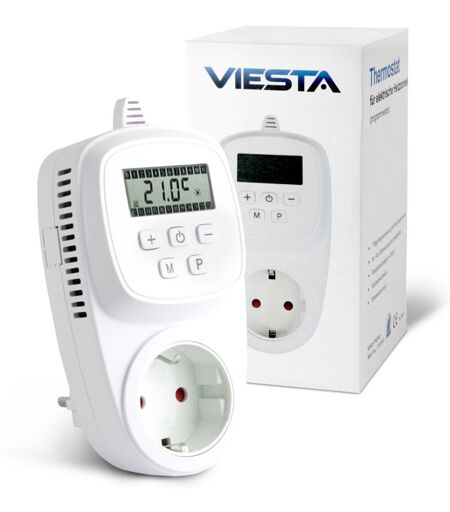 VIESTA® TH12 – Thermostat de prise programmable pour chauffages électriques jusqu’à 3 600 W ! Le VIESTA TH12 est un thermostat de prise programmable moderne, spécialement conçu pour une utilisation avec des appareils de chauffage électriques. Il suffit de le brancher dans la prise, de connecter l’appareil de chauffage et de profiter immédiatement d’un contrôle pratique de la température – sans installation compliquée. Avec une puissance allant jusqu’à 3 600 W , l’appareil est idéal pour les chauffages infrarouges, panneaux chauffants, radiateurs, cheminées électriques ou climatiseurs . Grâce à son utilisation intuitive avec seulement 5 touches et à sa programmation hebdomadaire flexible , vous gardez toujours le contrôle total tout en économisant de l’énergie. ✅ Caractéristiques principales et avantages : Programmation hebdomadaire flexible – Plans de chauffage personnalisés pour 7 jours avec jusqu’à 161 programmes de commutation par semaine. Modes multiples – Les modes confort, ...