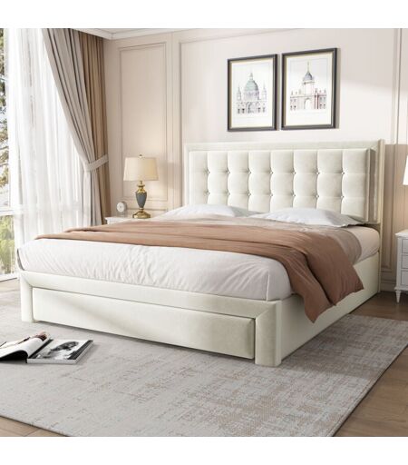 Wishdor - Lit coffre Lit adulte double capitonné 140 x 200 cm avec 2 tiroirs et sommier à lattes en bois, velours, beige