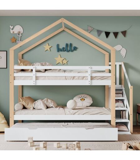 Dimensions et détails Nom du produit : Lit superposé Taille totale : 242*190 (largeur totale du lit coulissant)*223CM Matelas assortis (matelas non inclus) : Couchettes supérieures et inférieures : 90x200cm Lit coulissant : 90x190cm Capacité de charge : 100 KG Couleur : Naturel + Blanc Matériau du cadre : bois + MDF Matériau des lattes : bois Poids total : 85 KG Méthode d'assemblage : installez-vous vous-même Numéro du forfait : 3 Dimension détaillée du produit : veuillez vous référer à l'image des tailles Remarque : ※ Ce produit sera divisé en 3 colis pour la livraison. Ils pourraient ne pas arriver en même temps. Veuillez patienter patiemment. ※En raison des données de mesure manuelles, il peut y avoir une erreur de 2 à 3 cm. ※ En raison de la lumière, il peut y avoir des différences de couleur entre l'image du produit et le produit réel. Veuillez vous référer au produit réel reçu. ※ Si le client a des questions lors de l'installation, veuillez nous contacter dès que possible. ...
