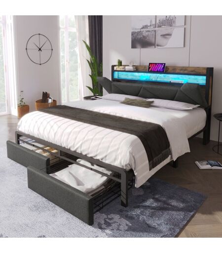 Hommoo - Lit adulte Lit double 160 x 200 cm avec fonction de chargement usb Type c et tiroirs, tête de lit avec éclairage led, gris, sans matelas