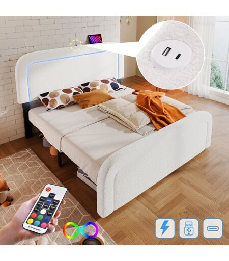 【Station de recharge pour tête de lit】 Nous avons également ajouté des ports de chargement USB+Type-C en haut de la tête de lit, vous permettant de recharger vos smartphones, tablettes et autres appareils électroniques ou de les charger directement depuis le lit. Vous n'avez plus besoin de vous lever pour recharger vos appareils, ce qui vous permet d'économiser du temps et de l'énergie. 【Lumières LED qui améliorent l'ambiance】 L'éclairage LED intégré crée l'ambiance parfaite et fournit une lueur apaisante, parfaite pour se détendre après une longue journée. 【Confort luxueux】La silhouette incurvée et la tête et le pied de lit épais rembourrés apportent un style rétro à n'importe quelle chambre, tandis que le faux sherpa confortable offre une expérience de détente ultime. 【Conception des rangements】Le lit simple est équipé de deux tiroirs que vous pouvez fixer à gauche ou à droite selon la disposition de la pièce. Les couvre-lits et les housses de couette peuvent facilement s'y glisser. ...