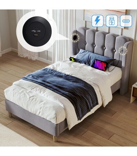 Hommoo - Lit adulte Lit adolescent capitonné 90 x 200 cm avec chargement usb Type c et sommier à lattes, lin, gris