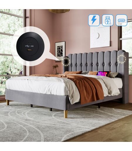 Hommoo - Lit adulte Lit adolescent capitonné 180 x 200 cm avec chargement usb Type c et sommier à lattes, lin, gris