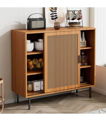 HOMMOO Commode avec 2 portes coulissantes et étagère réglable, buffet de cuisine, noyer