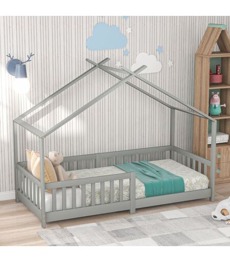 Hommoo - Lit cabane enfant 90 x 200 cm avec clôture et sommier à lattes, avec protection antichute, gris, sans matelas