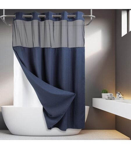 LNTYQ Rideau de douche en tissu gaufré sans crochet avec doublure à boutons-pression - 71 l x 74 h, qualité hôtelière, rideau de bain de type spa, bleu