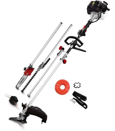 #Description# Véritable outil 4 en 1 pour votre jardin, cet outil multi fonctions vous rendra de nombreux services lors de vos travaux de jardinage. Doté d'un moteur thermique 2 temps de 33cc, cet outil multifonction peut adopter différents rôles : - Débroussailleuse : Dotée d'une lame 3 dents d'une largeur de coupe de 23 cm - Coupe-bordures : La largeur de coupe avec le fil est de 44 cm - Taille-haie : Doté d'une longueur de coupe de 39 cm - élagueuse : Avec un guide de 25 cm Cette débroussailleuse thermique 4 en 1 est équipée d'une sangle qui vous permet de la porter facilement, d'un guide et d'une chaîne Oregon, d'une allonge de 78cm et d'une bobine de fil supplémentaire d'une longueur de 40M. Caractéristiques : - Cylindrée : 33 cc (2temps) - Largeur de coupe avec la lame 3 dents: 23 cm - Largeur de coupe avec le fil: 44 cm - Diamètre du fil: 2.5mm - Livré avec une bobine de fil supplémentaire d'une longueur de 40M - Longueur de coupe de la lame du taille haies: 39 cm - Capacité de ...