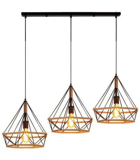 STOEX Luminaire Suspension en forme Diamant de Style Industrielle Vintage, Lustre Abat-jour Corde de chanvre Industrial 3 Douille DIY Metal, Noir