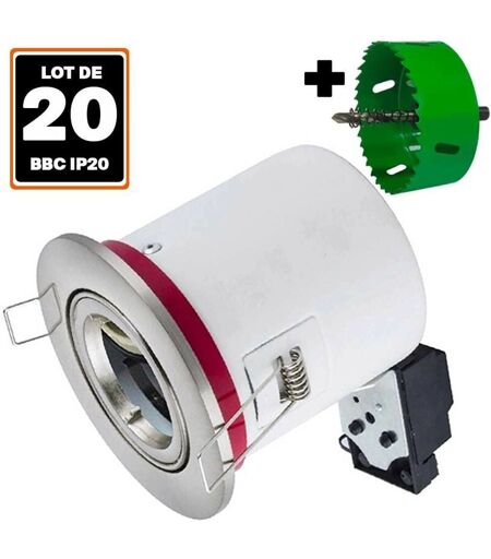 x20 Supports Spot BBC Alu brossé avec Douille GU10 + 1 Scie cloche 85mm Ce support de spot spécialement conçu pour le respect du label BBC (Bâtiment Basse Consommation) et la norme RT2012 (isolation et échanges thermiques) est complètement étanche à l'air. Tout flux d'air entre la pièce à éclairer et le faux plafond est impossible grâce à sa cloche de protection! De même qu'une protection thermique est également assuré entre le spot et l'isolant. Le remplacement de l'ampoule du support de spot est vraiment facile car sans démontage grâce au système 1/4 de tour on peut la changer. Une douille GU10 équipée d'un connecteur automatique intégré au support est fourni. ? Respect norme RT2012. ? Protection thermique entre le spot et l'isolant. ? Facile remplacement de l'ampoule. ...