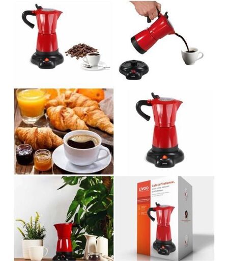 Livoo Cafetière Italienne Électrique Rouge Et Noir 6 Tasses Socle Pivotant À 360° Témoin Lumineux