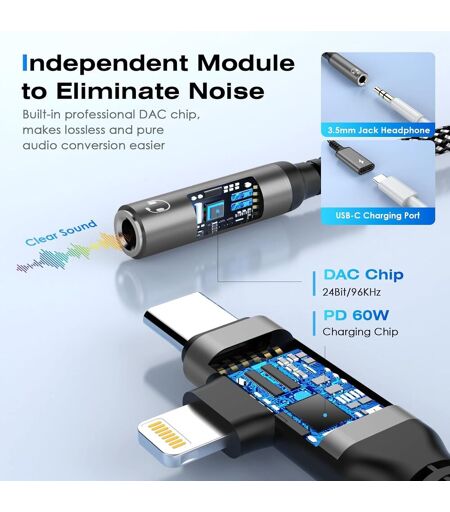 Adaptateur Lightning USB C vers jack 3,5 mm pour casque audio et chargeur Cet adaptateur iphone Lightning USB C vers jack 3,5 mm connecte les téléphones sans prise audio 3,5 mm ni port USB C à des écouteurs, casques audio, enceintes et autres appareils audio. La charge rapide PD60 W vous permet d'écouter de la musique de haute qualité sans vous soucier de la batterie de votre téléphone. La transmission audio de haute qualité et l'absence de bruit électrique ne vous feront pas mal aux oreilles.Prise en charge de la fonction audio d'origine Cet adaptateur prise Lightning USB C vers jack 3,5 mm prend en charge le contrôle de la musique et des appels sur la plupart des téléphones portables. Les touches de fonction du casque vous permettent de passer des appels, de régler le volume, de mettre la musique en pause, etc. Écoutez de la musique tout en chargeant votre téléphone. Remarque l'iPhone ne prend pas en charge les appelsCharge PD 60W et performances audio haute fidélité Ce 2en1 USBC lighning cable auxiliaire voiture iphone, DAC haute résolution et dongle de charge rapide prend en charge la charge rapide USBC 60W PD. Ne vous inquiétez plus de la batterie déchargée. Cet adaptateur casque USBC pour téléphone 16 po intègre une puce de décodage DAC intelligente prenant en charge une sortie audio jusqu'à 96 kHz et 24 bits, pour une meilleure expérience musicale.Répartiteur de téléphone à large compatibilité L'adaptateur ecouteur iphone offre une large gamme de compatibilité. Le connecteur Lightning est compatible avec les séries iPhone 14, 13, 12, 11 Plus, Pro Max, X, 8 et XR. Connecteur USB C compatible avec iPhone 16/16 Plus/16 Pro/16 Pro Max/15/15 Plus/15 Pro/15 Pro Max/Samsung Galaxy S25/S24/S23/S23/S23 Ultra/S22/S22/S22 Ultra, S21/S21/S21 Ultra, Note 20/S21 Ultra, Note 20, 10/10, 9/8, Pixel 4, Huawei, One Plus, etc.Qualité supérieure et durabilité L'adaptateur prise jack iphone Lightning et USB C est fabriqué avec une couche extérieure argentée de haute qualité et un revêtement en alliage d'aluminium poli pour un look élégant. Cet adaptateur USB C vers prise casque 3,5 mm est conçu avec un dispositif antitraction et a passé plus de 40 000 tests de flexion, ce qui le rend plus durable. ...