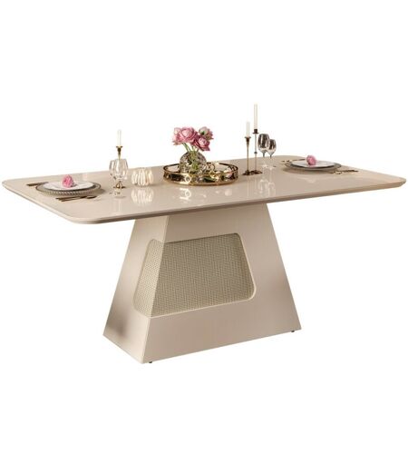 Description générale Table de Salle à Manger Rectangle 180 x 90 cm pour 6 personnes, coloris blanc écru. Cette table combine fonctionnalité et élégance avec son design moderne. Spécifications techniques Longueur : 180 cm Hauteur : 80 cm Profondeur : 90 cm Épaisseur du plateau : 25 mm recouvert d'un verre laqué blanc de 4 mm Pieds en forme trapèze avec décor style canage Poids total net : 64 kg Bois certifié FSC, issu de forêts gérées durablement Garantie : 2 ans Compatibilité et accessoires Compatible avec des chaises standard pour salle à manger. Une notice de montage papier sera jointe au meuble. Installation Meuble livré démonté Difficulté de montage : Facile à 2 personnes Notice de montage disponible en téléchargement Utilisation Idéale pour les repas en famille ou entre amis, cette table peut accueillir confortablement jusqu'à 6 personnes. ...