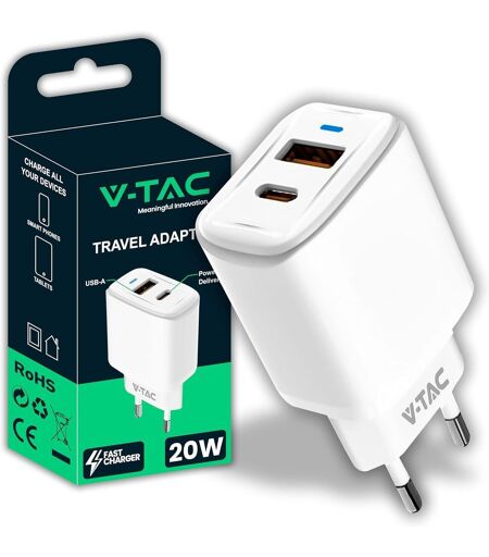 PUISSANCE MAXIMALE, TAILLE MINIMALE Ce chargeur VTAC 20W utilise la toute dernière technologie GaN III et est 50 % plus compact que les chargeurs dorigine Apple et Samsung. Glissezle dans votre poche, votre sac à dos ou votre sac à main il vous accompagne partout. Compact, robuste, conçu pour durer dans le temps.COMPATIBLE AVEC TOUS LES SMARTPHONES Compatible avec iPhone 11 / 12 / 13 / 14 / 15 / 16 modèles PRO et MAX XR, XS, XS iPad Pro SAMSUNG S22 / S23 / S24 / S25 Plus / Ultra / FE 5G / Galaxy A26 / A36 / A56 / A12 / A02S / A51 / A71 / A22 / A14 / Note s tous les autres smartphones, tablettes et appareils électroniques du marché.TECHNOLOGIE DE POINTE Système Power Delivery PD] pour une efficacité maximale et une génération de chaleur réduite, le tout dans un design ultracompact. Les composants VTAC garantissent une charge rapide et stable.TECHNOLOGIE DE POINTE Système Power Delivery PD] pour une efficacité maximale et une génération de chaleur réduite, le tout dans un design ultracompact. Les composants VTAC garantissent une charge rapide et stable.UN DESIGN UNIQUE Sa forme et ses dimensions mini rendent cet adaptateur mural parfait pour être emporté partout en voyage, en déplacement, au bureau, au travail ou chez des amis. Agréable à l'?il et extrêmement rapide pour recharger votre smartphone. ...