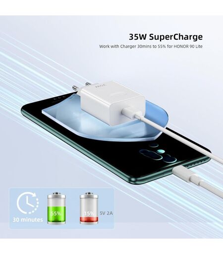 35W Superchargepour Honor 400 smart X70i 400 Lite Pad X9a X8c X6C Pad V9 X9c Smart Play9T X7c X60 200 Smart X60i Pad 9 Pro Play 60 Plus X7b 5G 50 MP Magic V Flip X6b 200 Lite 90 Smart X7b 5G X50 GT Pad 9 X8b Magic6 Lite X7b X50i X9b/Play 8T Play 50 Plus X50i 90 Pad V8 Pro. 22.5W Superchargefor Honor Pad V8 Play7T 70 Lite 70 Lite X8a X7a Play 40 Plus Play6C X8 5G Pad 8 Play6T X7 X8 Play 30 Plus X30 Max X30i.35w SuperCharge pour honor/huaweiCe câble USB C pour HONOR 400 Lite 5G supporte la SuperCharge jusqu'à 35W Max 11V/3.5A. Prend également en charge la SuperCharge Huawei/Honor de 22,5 W. Avec ce chargeur USB 35W, les téléphones Huawei et Honor peuvent être chargés à 55% en 30 minutes. Si la puissance est inférieure à 35W, le temps de charge sera plus long. Comment effectuer la SuperCharge ? 1. Vous utilisez Huawei et Honor ; 2. votre téléphone supporte 35w/22.5w SuperCharge;Sécurité supérieure Le circuit intégré intelligent intégré protège vos appareils contre les surintensités, les surchauffes et les surcharges. Le système de sécurité assure une protection complète pour vous et vos appareils.Conception durableLe câble de type C est conforme aux certifications de sécurité électronique. Il est fabriqué en TPE et présente une excellente résistance à l'oxydation. Peut résister à plus de 15 000 tests de flexion. Le boîtier en aluminium et les ports soudés au laser empêchent les ruptures et les fuites de fils.Emballage 1 câble Supercharge de type C 5 A de 3,3 pieds ; 1 chargeur SuperCharge 35 W pour Honor. ...
