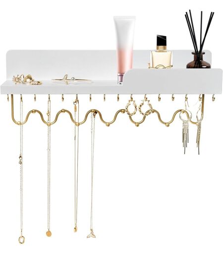Cauc-Support Mural À 29 Crochets, Étagère À Bijoux Décorative En Bois Blanc Avec Barre Ondulée En Métal Doré Et Garde-Corps Pour Collier, Pendentif, Chaîne, Bracelet