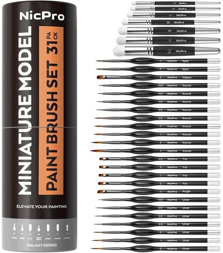 Set de 31 pinceaux ultimes 24 petit pinceaux de détails liners 10/02, ronds 20/04, plats 2/02, noisetier 2, biseauté 3, pinceau étroit 01 et 7 pinceaux secs 3, 5, 7, 8, 9, 11, 131/2. Comparé aux ensembles plus petits, cet ensemble étendu permet des détails ultrafins, des estompages fluides et des effets de texture audacieux. Idéal pour les peintres de miniatures exigeant tous les outils dans un seul kit.Pinceaux secs professionnels Mélange de poils de chèvre Fabriqués à partir d'un mélange de poils de chèvre naturels et synthétiques, ces 7 pinceaux secs offrent une rigidité et une élasticité optimales pour les effets de vieillissement, les effets métalliques, la rouille, la texture et la profondeur sur les maquettes et les miniatures. Avec plus de tailles que les sets standards, cette gamme étendue assure une couverture précise des grandes surfaces aux microrefletsPinceaux peinture de détail haut de gamme Précision et contrôle Les 24 pinceaux fins sont dotés de poils synthétiques durables offrant une excellente absorption, une application fluide et une excellente tenue de forme. Leurs manches ergonomiques triangulaires réduisent la fatigue de la main et leurs viroles à double sertissage préviennent la perte de poils. Idéal pour les longues séances de peinture acrylique, à l'huile, à l'aquarelle, à la gouache et au modélisme.Conçu pour les miniatures et plus encore Des figurines militaires et maquettes au nail art, à la peinture rupestre, aux maisons de poupées et à la peinture par numéros, ce set s'adapte à tous les scénarios. Avec le plus grand choix de formes du marché 31 pièces, vous disposez toujours de l'outil idéal pour les yeux, les contours d'armures, les bases de terrain ou les reflets délicats du visage.Conçu pour durer Approuvé par les amateurs et les professionnels Chaque pinceau est conçu pour durer les poils reprennent leur forme après chaque lavage, les viroles restent bien serrées et les manches résistent à l'usure. Que vous utilisiez des glacis superposés ou des effets de rouille au brossage à sec, ce coffret de 31 pièces offre une performance fiable, projet après projet.Emballage élégant et prêt à offrir Présenté dans un tube en carton robuste avec une pochette de transport en velours pour le transport et la protection. Un cadeau attentionné et de qualité supérieure pour les peintres, les amateurs et les étudiants, idéal pour les anniversaires, les fêtes ou toute autre occasion. ...