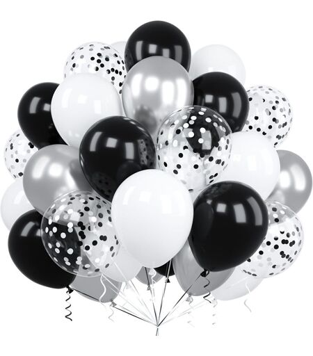 CAUC-60 Pièces Ballons Noir Blancs, 12 Pouces Métallique Chrome Argentés Confettis Latex Hélium Ballon avec Ruban pour Enfant Filles Garçon Fête Anniversaire Baby Shower Mariage Baptême Festival Déco